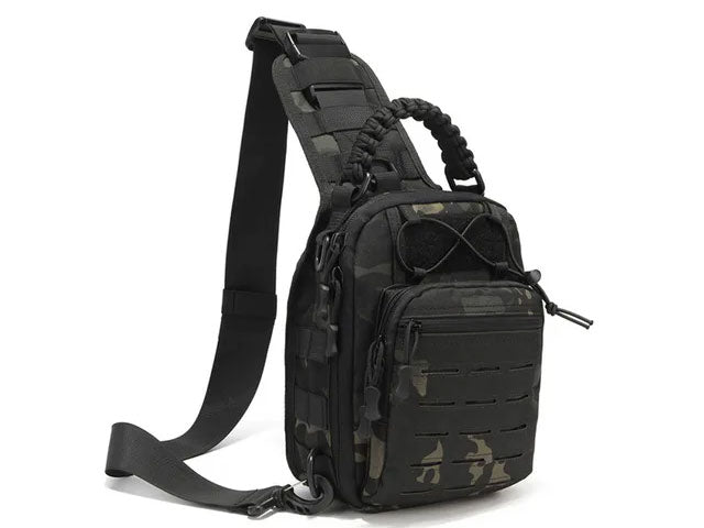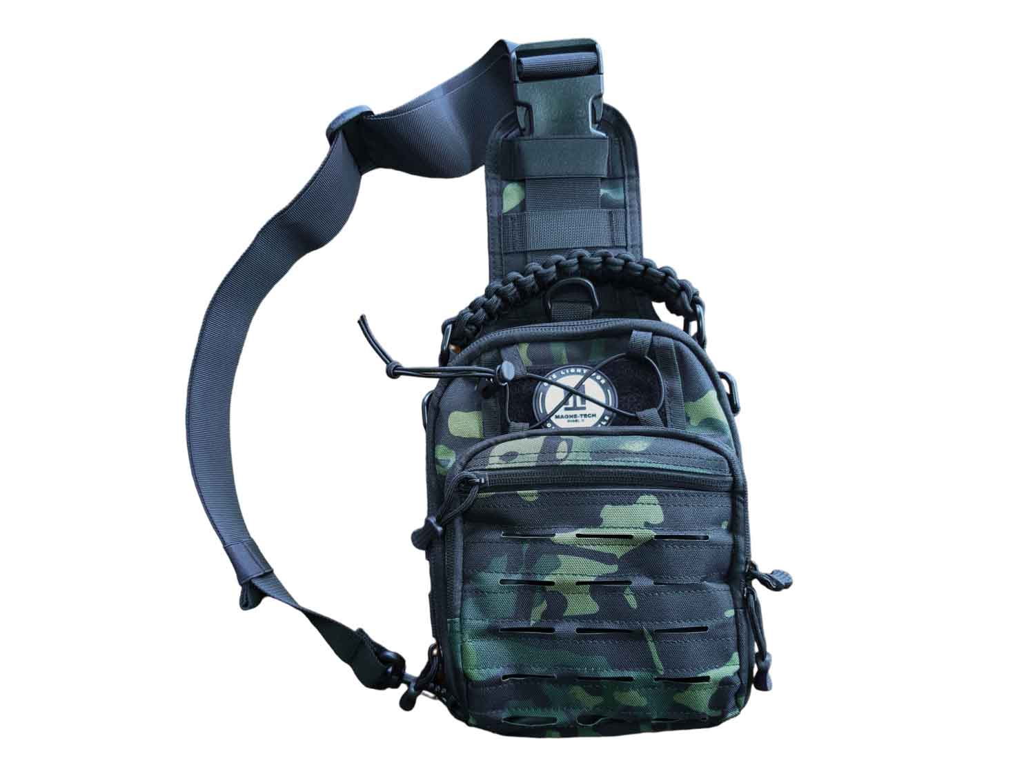 This sling pack is the perfect size for concealed carrying. The dark camo look and molle webbing add a tactical look and functionality to the bag.